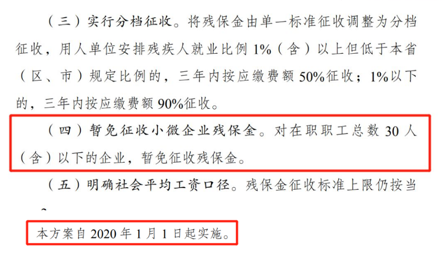 发改委等六部门印发《关于完善残疾人就业保证金制度更好促进残疾人就业的总体方案》(发改价格规[2019]2015号),明确自2020年1月1日起:对在职职工人数30人(含)以下的企业,暂免征收残保金。